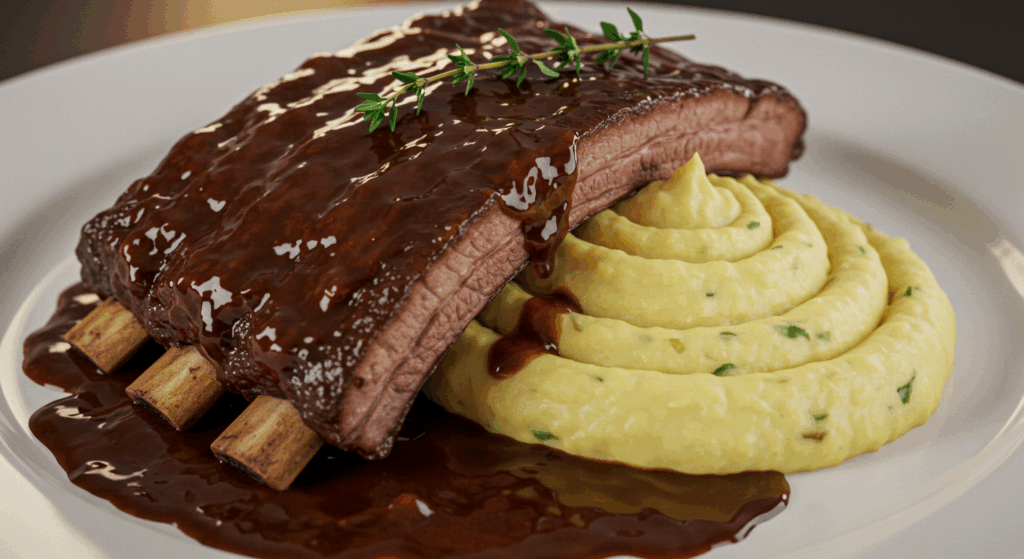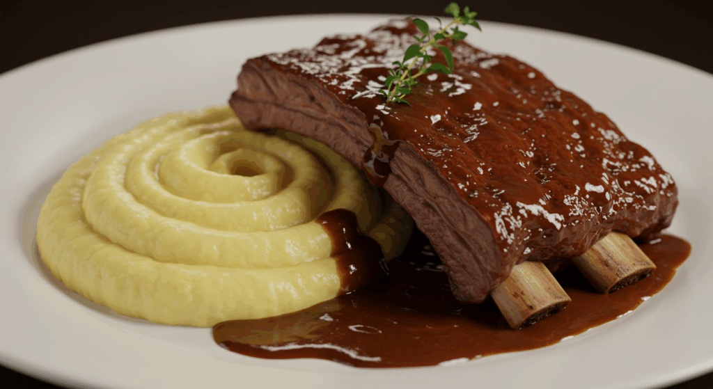 - Toque Francês: Coloque a costela sobre uma cama de um purê de batata liso e aveludado (purée de pommes de terre), feito com bastante manteiga e talvez um toque de creme de leite.